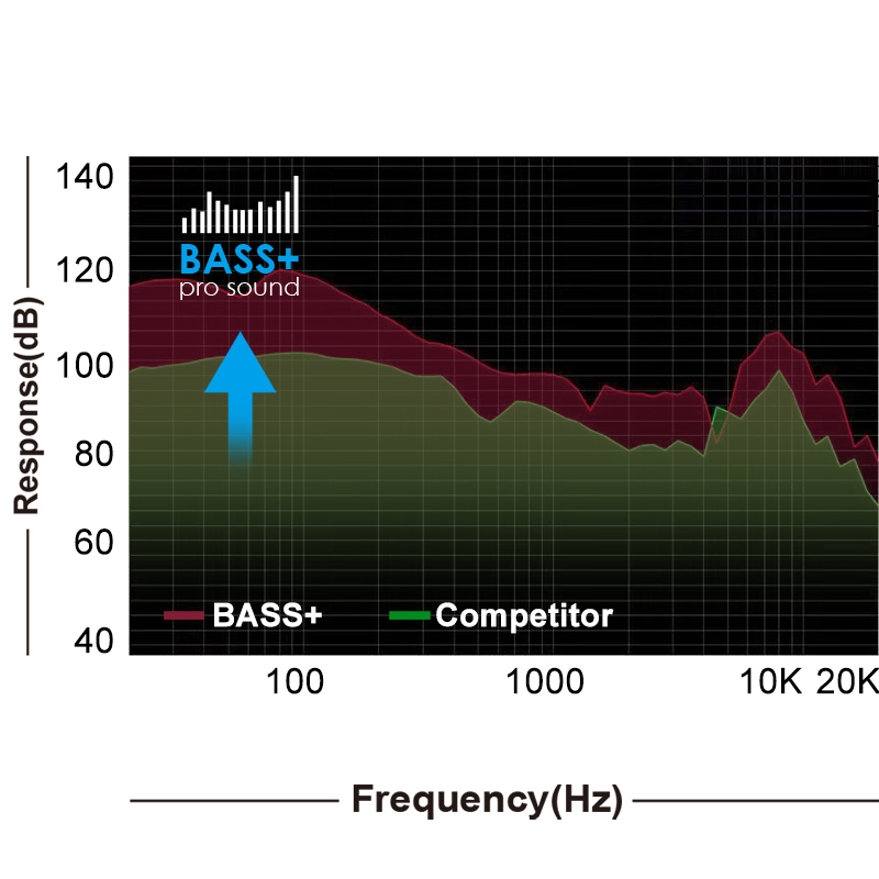 Bass is the most important frequency on the audio spectrum-seeing the sound curve, with clear, pleasing sound profile that will appeal to most listeners. The frequency response_closely matches our target response curve for the most part, to analyze and intensify bass frequencies in real-time.